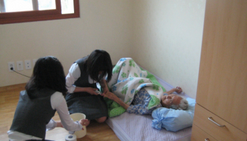 월정사복지재단 자원봉사대학 자원봉사자분들의 어르신 발맛사지 자원봉사 활동 사진입니다. 피부 마찰력 감소와 사람간의 교감증진을 위해 맛사지크림으로 발을 매끄럽게 한 후 지압을 이용하여 발과 다리를 주물러 드리자 저희 어르신들 다른 어떤 물리치료 기계보다 사람의 손길이 좋다하시며 너무나 만족해 하셨습니다. 자원봉사자님들의 보살행에 감사드립니다.